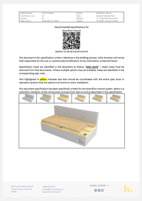 CDM Stravitec elastomeric bearings ensure a high-performance floating floor, providing exceptional structure-borne and airborne noise isolation. The system can be installed with normal-weight concrete, lightweight concrete, or panelized floor systems using plywood or cement boards.